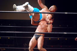 Tバック一枚になってフライングフォアアーム、コーナーに上ってダイビングショルダーブロック(右写真)、カウント2。