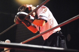 コーナーに詰めてパンチ連打(左写真)、腰を落としたところにバズソーキック。