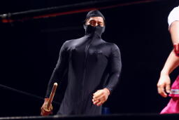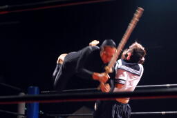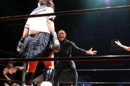 佐藤は平田にストンピング、首投げからサッカーボールキック、カウント2。マイケルにタッチ。マイケルは竹刀攻撃、また佐藤にタッチ。佐藤腕ひしぎ十字固め(左写真)、平田ロープ。