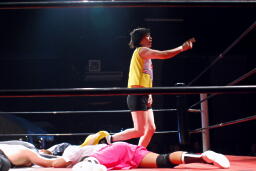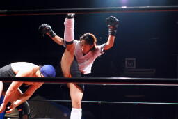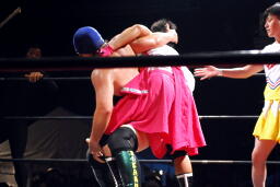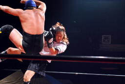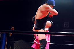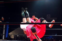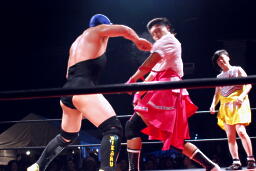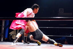 佐藤タックル右写真)、バック取る、平田腕を取って切り返す、佐藤切り返してヘッドロック、平田はエビ固めに、佐藤キックアウト。