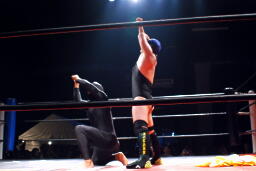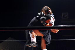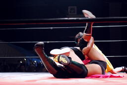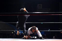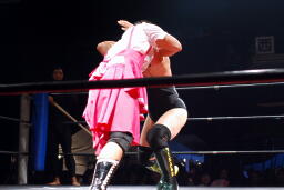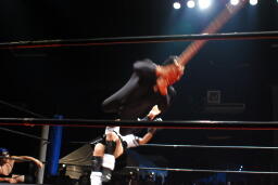 佐藤ブレーンバスター狙う、平田ブロックして逆に投げようとするが佐藤は首固めに(右写真)、カウント2。