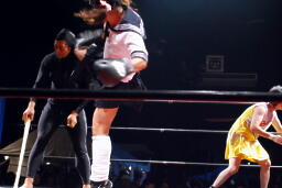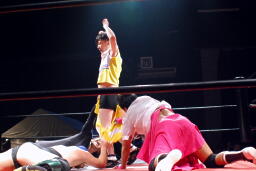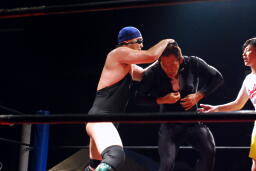 しかし誤って木曽レフェリーのスカートを脱がしてしまう。木曽レフェリーは没収試合を宣告(右写真)。
