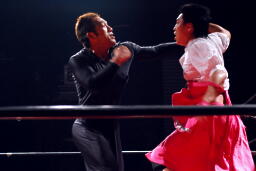 竹刀持ったままストンピング、そしてドロップキック(右写真)。最初っからそれやった方が面白かったのに。10分経過。