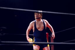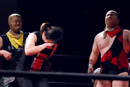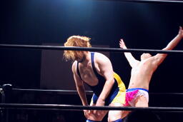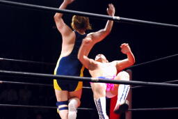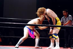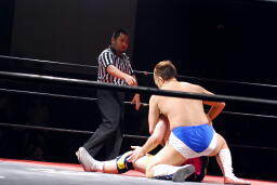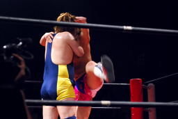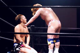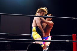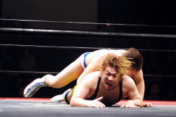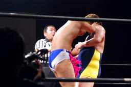 ディーノ首投げから「死ね〜」なしで男色ベアハッグ(右写真)。