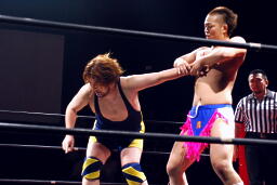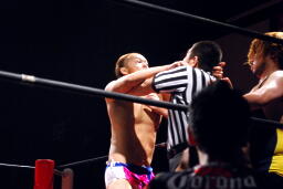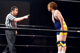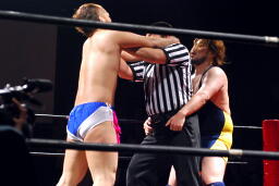 場外戦は福田が優勢(左写真)。ディーノはパンチを受けるたびに男性客にすがりつく。