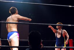 ディーノコーナーに振る、福田切り返して串刺しエルボー、ロープに飛んでアックスボンバー?連打(左写真)