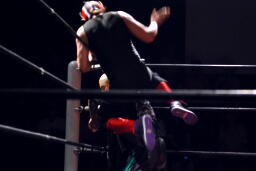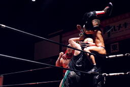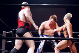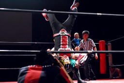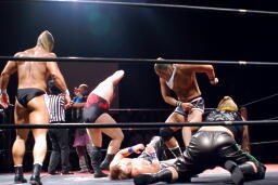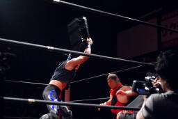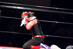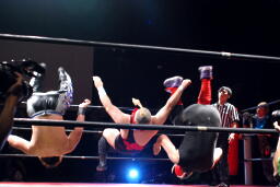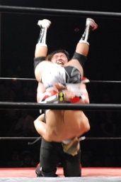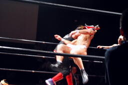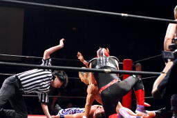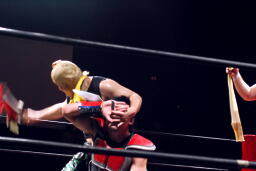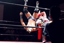 HARASHIMAウラノをコーナーに振って突っ込む、ウラノカウンターのキック、HARASHIMAキャッチして横に払い子泣きクラッシュ、コーナーに上げて雪崩式ブレーンバスター(右写真)、4人でカット。