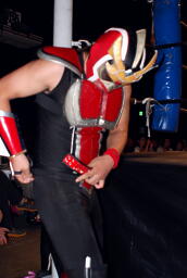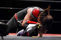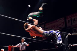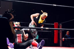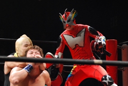 平田をターンバックルにぶつけて後頭部にニーアタック、そして「パンストなんかかぶるかー!」と平田を投げ飛ばす(右写真)。