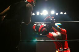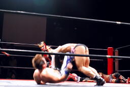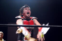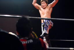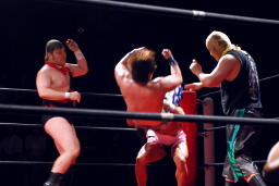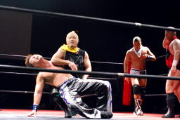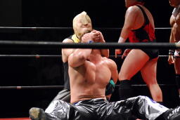 ウラノがHERO!に張り手連打、コーナーに詰めてガットショット、逆水平。対角線コーナーに振る、HERO!かわして後頭部にニーアタック(左写真)、HARASHIMAにタッチ。
