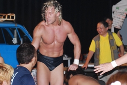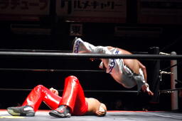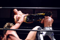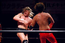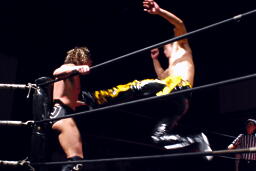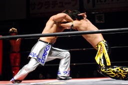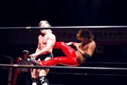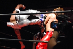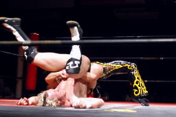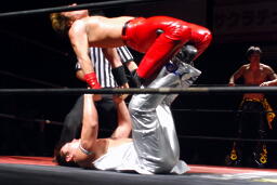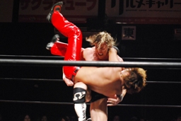 ロックアップからケニーヘッドロック(右写真)、高尾ロープに振ろうとするがケニー振らせない。高尾切り返してヘッドロックに、ケニーバックドロップの形で持ち上げる、高尾着地。