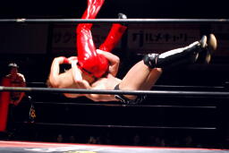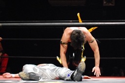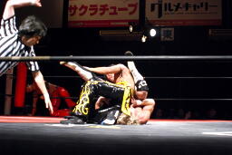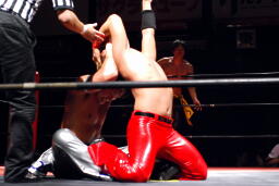 しかしパワーボムは高尾が低空ドロップキックで阻止、KUDOエビ固めに(右写真)、カウント2。KUDOは高尾にタッチ。