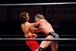 ケニー高尾の背中にパンチ、高尾は下から捕まえてチンクラッシャー(左写真)、延髄蹴り。