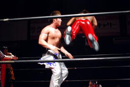 高尾串刺しエルボーからコーナーに上ってミサイルキック、ケニーかわしてロープに飛ぶと低空ドロップキック(左写真)。