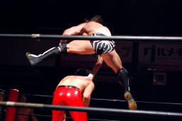 そこにHARASHIMAがスワンダイブプレス、KUDOがカット。ケニーがKUDOを場外に出しHARASHIMAがプランチャ(左写真)。