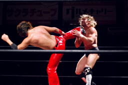 ケニーは高尾の腕を取り起き上がりこぼし式でバックハンドチョップ(右写真)とヘッドバットを交互に打ち込む。