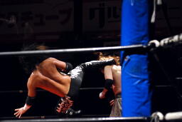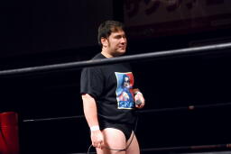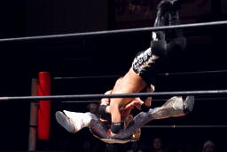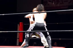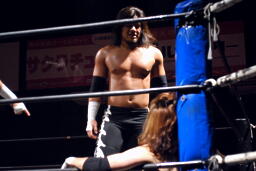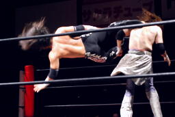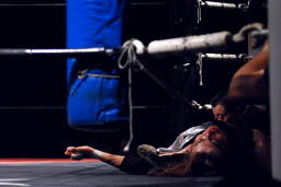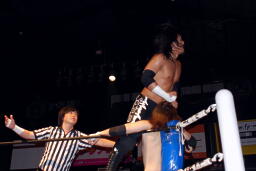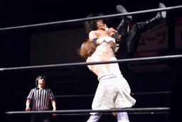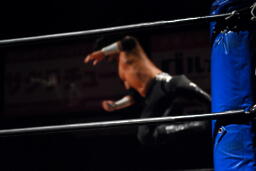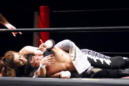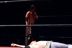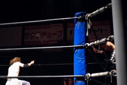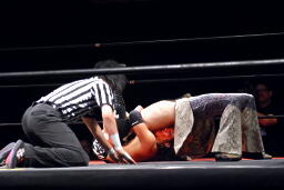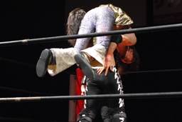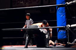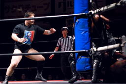 佐々木パンチ連打(右写真)、ダウンしたところにストンピング。ロープに振ってバックエルボー、カバー、カウント1。さらにカバーを繰り返すがポイズンは2で返す。5分経過。