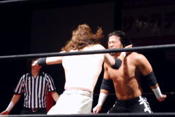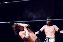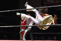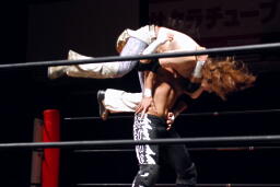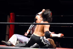 ポイズンストンピング、チョークスラム(右写真)。キャトルミューティレーションに行くが佐々木はブロックしてロープ。