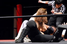 ポイズン首固め、カウント2。ジャックナイフ(左写真)、カウント2。