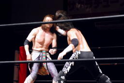 ポイズンチョークスラム狙う、佐々木ブロックしてロープに押し込み延髄蹴り(左写真)。