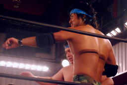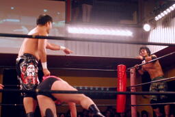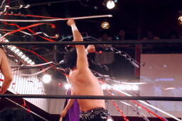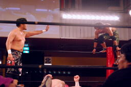 MIYAWAKIはうっちーに「お前の得意技はダイビングヘッドバットだったな。コーナーに上がれ。」と上がらせると(右写真)「ここに2体の屍がある。どっちにダイビングヘッドバットを落とすか5秒のうちに決めろ。」と迫る。