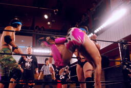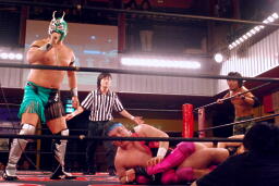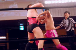 エッちゃんを肩に担いでバックフリップ(右写真)、カウント2。