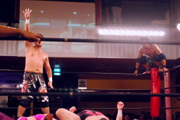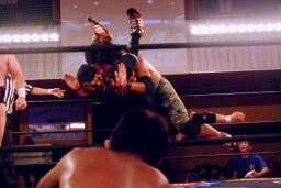 カイザー暗黒ボンバーからボディスラム、コーナーに上ってフライングボディプレス(右写真)、うっちーのカット間に合わず、アントン自力で返す。