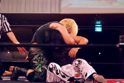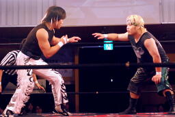 MIKAMIひっくり返してダブルの倒立。両者腹にパンチを打ち合う(左写真)、ブレーク。