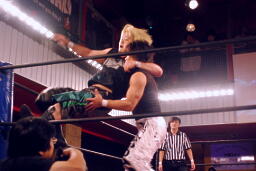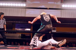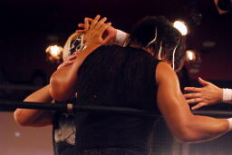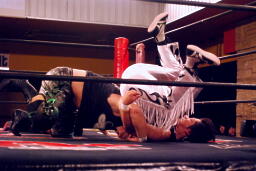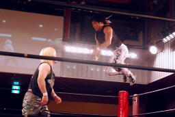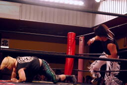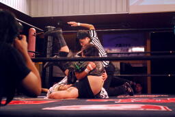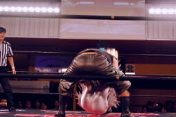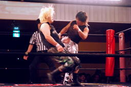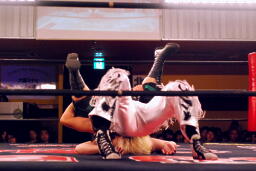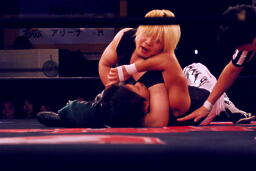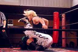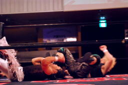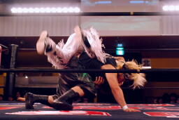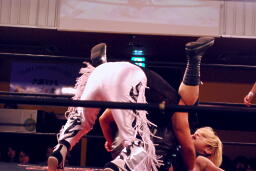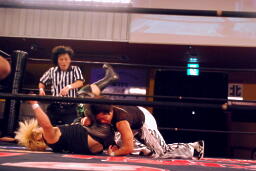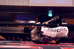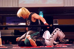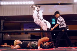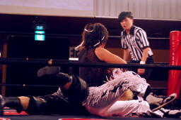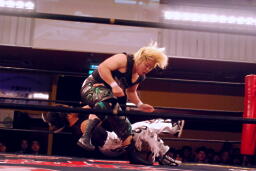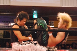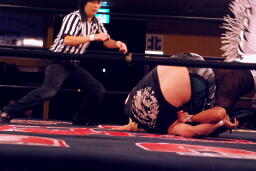 立ち上がってMIKAMIにパンチ、コーナーを使ってのフライングメイヤー(左写真)、MIKAMIエビ固めに、カウント1。