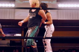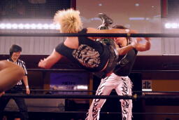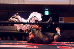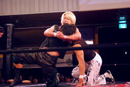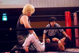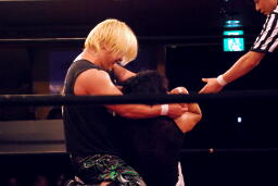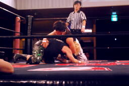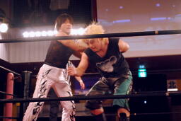 ウラノ立ち上がってヘッドロック(左写真)。MIKAMIロープに振る、ウラノショルダーブロック。