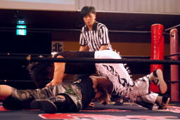 MIKAMIは倒立で脱出(右写真)、ウラノフライングメイヤー。5分経過。