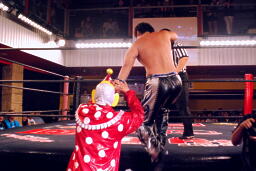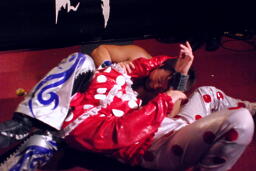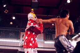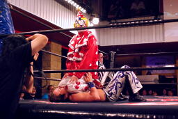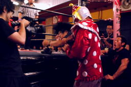 HARASHIMAのハイキックをかわしスクールボーイ(左写真)。HARASHIMA場外に。くいしんぼうも後を追う。