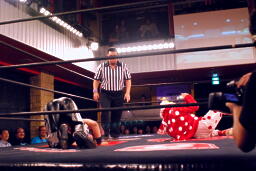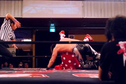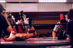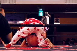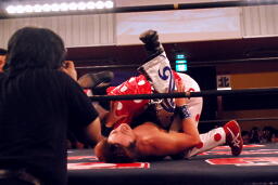 くいしんぼうスクールボーイ(左写真)、松井レフェリーは速いカウント、カウント2。