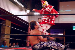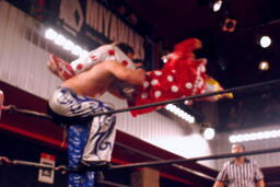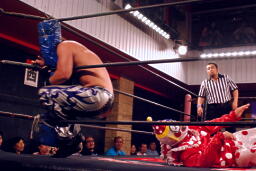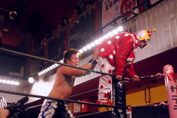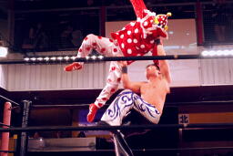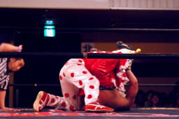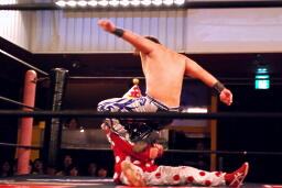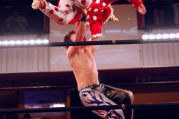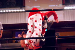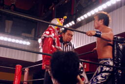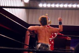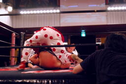 くいしんぼうボディスラムから関空トルネード狙ってコーナーに上る、HARASHIMA立ち上がって尻を叩く(右写真)