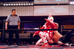 HARASHIMAを追い抜いてしまい逆に串刺しラリアットくらう(左写真)。HARASHIMAカバー、カウント2。