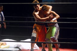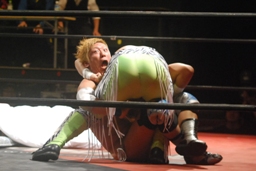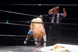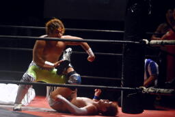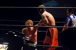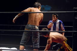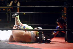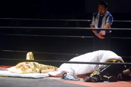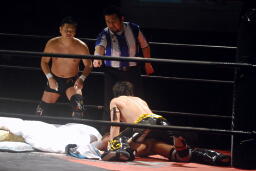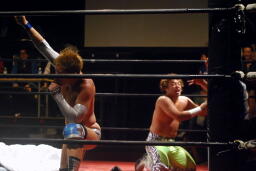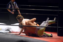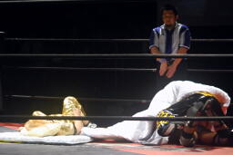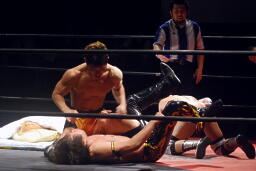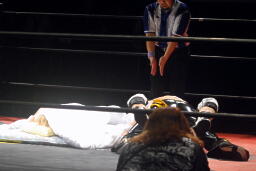 大石首固めに(左写真)、松井レフェリー普通にカウントしようとマットを叩きみんなに怒られる。