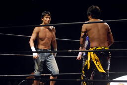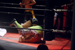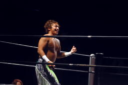 DDT48総選挙にエントリーしてるけどなかなか試合のチャンスがない選手を出すということでこのカードに。しかし世W虎を起こさないようできるだけ静かに試合することに。入場テーマも最小音量、手拍子もなしでひっそりと入場(右写真)。