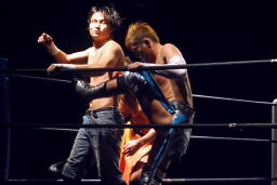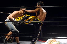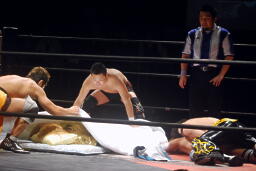 吉田は翔太にタッチ。翔太はコーナーの2人を場外に落とす(右写真)。