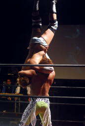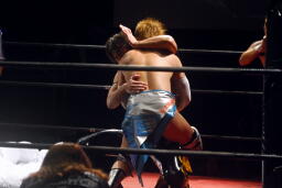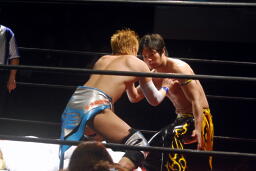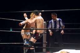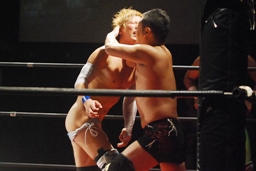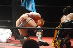 翔太超滞空時間ブレーンバスター狙う(右写真)、