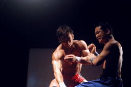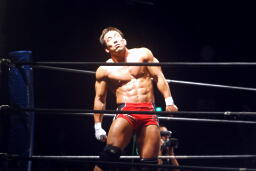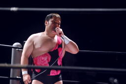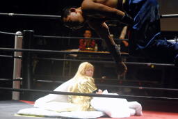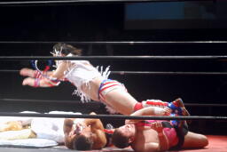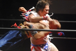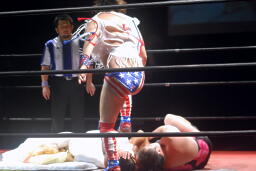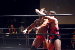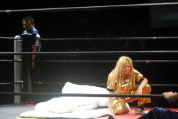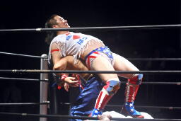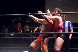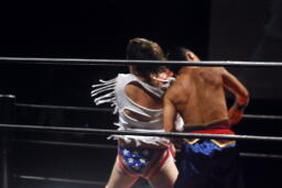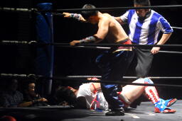趙雲とばってんがリングに戻る。ばってんエルボースマッシュ(右写真)。