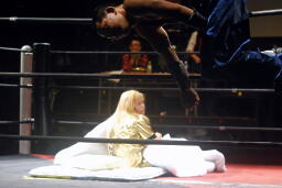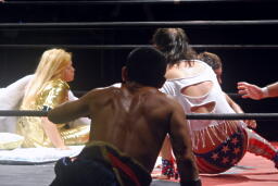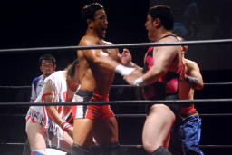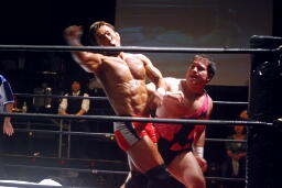 しかし殴り合いが始まるとどうしても大声を出してしまうレスラーたち(左写真)。
