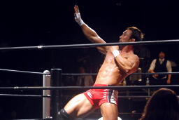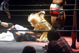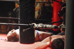 コーナーに上る(左写真)。しかしダイブしたら音が立つのでゆっくりとリングに降り片エビ固め、カウント2。