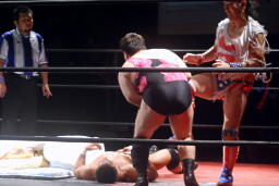 世W虎はまた平田にラリアット、マウントパンチ(左写真)。平田失神。