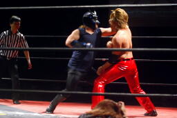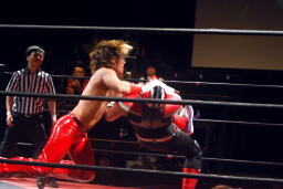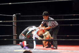 HERO!は「飛んでけー!」をブロックされるとHERO!目突きを連発(右写真)、そしてDDT、カウント2。