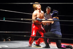 高尾がエルボー連打するがHERO!は「パワードスーツ!」(左写真)