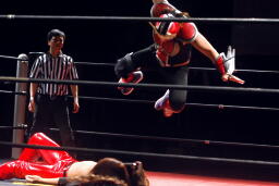 HERO!は高尾の顔面をターンバックルにぶつけ、後頭部にヒザ蹴り(左写真)。