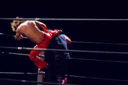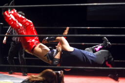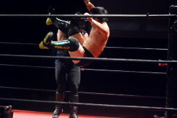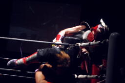 高尾がダイビングギロチン狙ってコーナーに上る、ダークサイドがブラックボックスで一撃(右写真)。