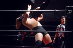 HERO!サミング、ボディスラムからニードロップ(左写真)、カウント2。ダークサイドにタッチ。5分経過。