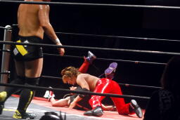 高尾ミサイルキック、ダークサイドあっさりスカし(右写真)HERO!にタッチ。