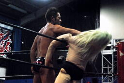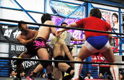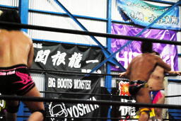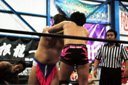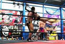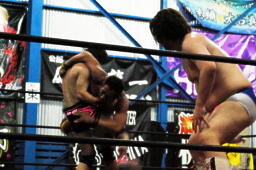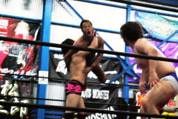 石井が入りマイケルにガットショット、コーナーのディーノ目掛けて投げつける(右写真)。5分経過。