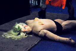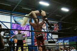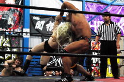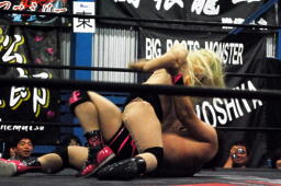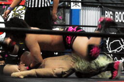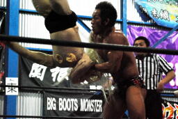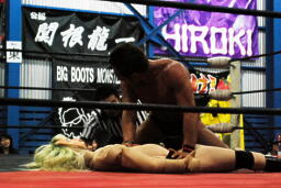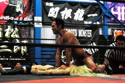 ディーノの上にボディスラムで投げつける(左写真)。2発目のブレーンバスターははディーノかわす。石井マイケルはほっといてディーノをカバー、カウント2。